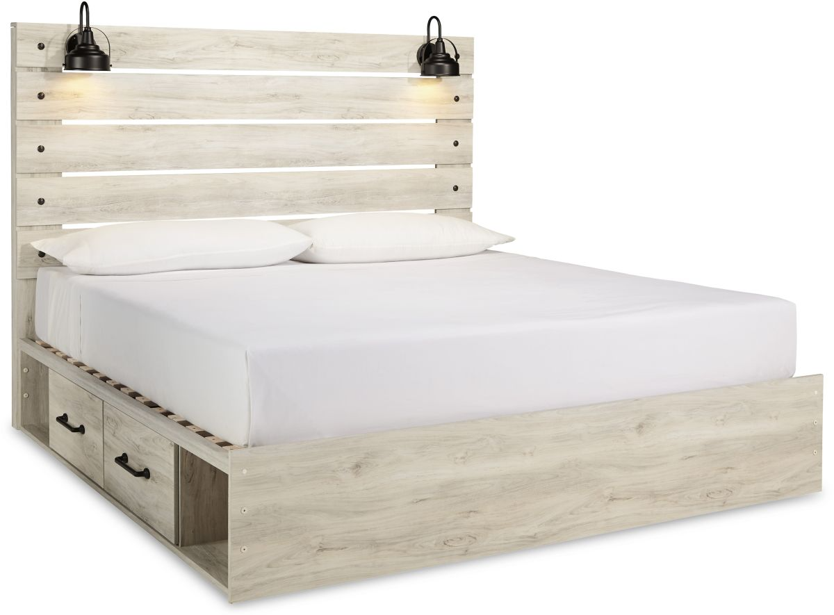 What a delightful take on rustic industrial style. Whether modern loft or modern farmhouse, this king panel storage bed makes itself at home. The wispy whitewash palette enhances without covering the grain for that weathered look you crave.Read More