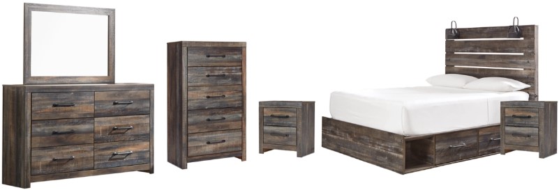 *Queen panel bed (headboard, footboard, platform rails, side storage unit and wood roll slats), 6-drawer dresser with mirror, 5-drawer chest and two 2-drawer nightstands only, all other products are sold separately. Images may not reflect actual size. Furniture color in images may differ in person; see retailer for actual finish.