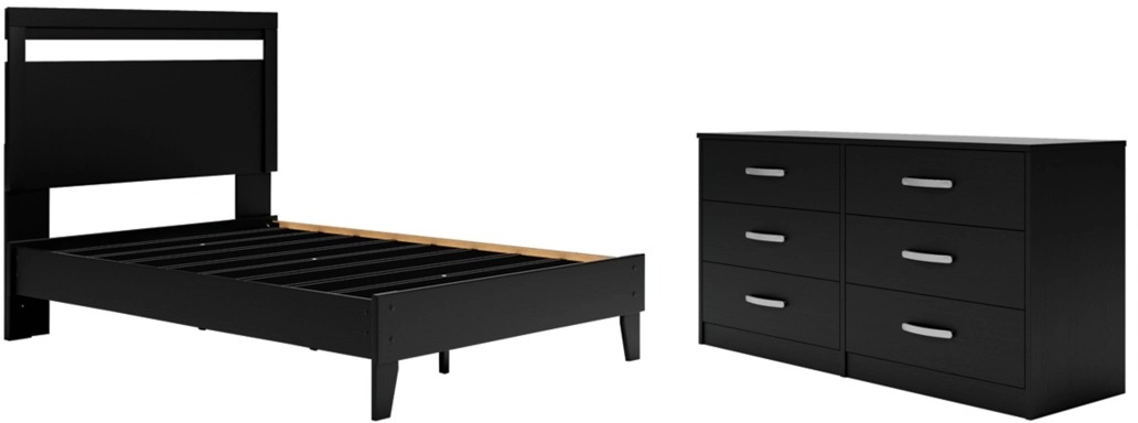 Includes full panel platform bed (headboard, footboard, rails and platform) and 6-drawer dresser