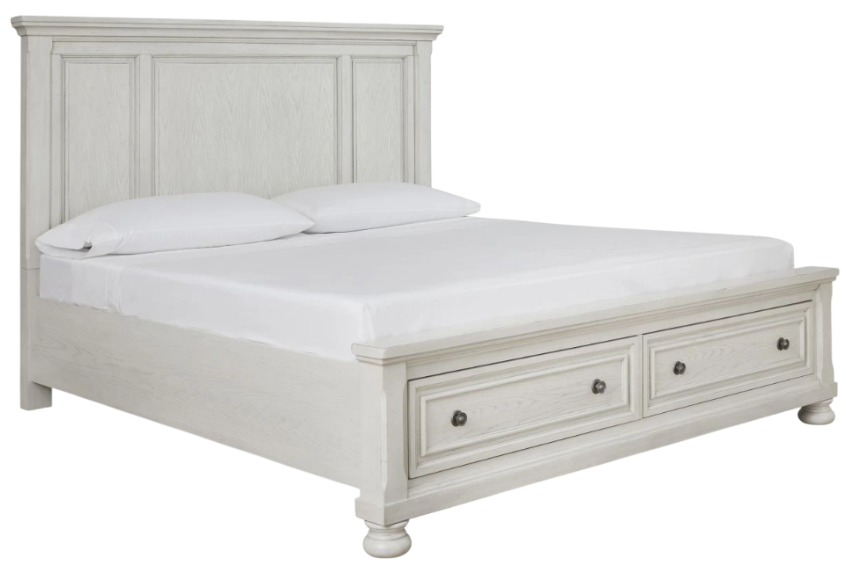 Includes panel headboard, storage footboard and rails with roll slats
