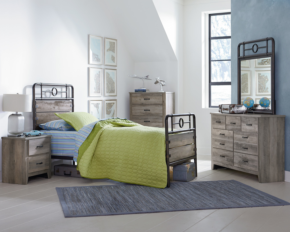 Barnett Youth Bedroom has a rustic industrial mood that works great for guys. It comes in a great looking distressed pine color finish with metal pipe elements in a black bronze color. Set Includes Youth Dresser, Mirror And Metal Twin Bed.
