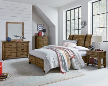 Nelson Youth offers a smart kids’ room option of relaxed clean square profiles and industrial accented metal straps with a well-designed footboard storage option. A timeless design that blends well with modern to rustic casual styles.