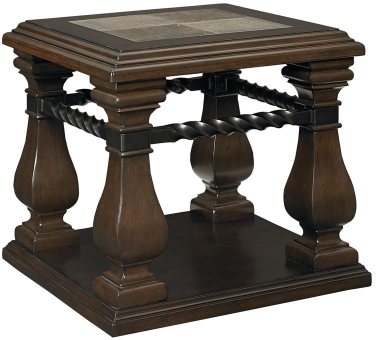 This rectangular End Table features include shaped double look tops with inset slate tiles, twist turned metal stretchers and oversized square turned legs.