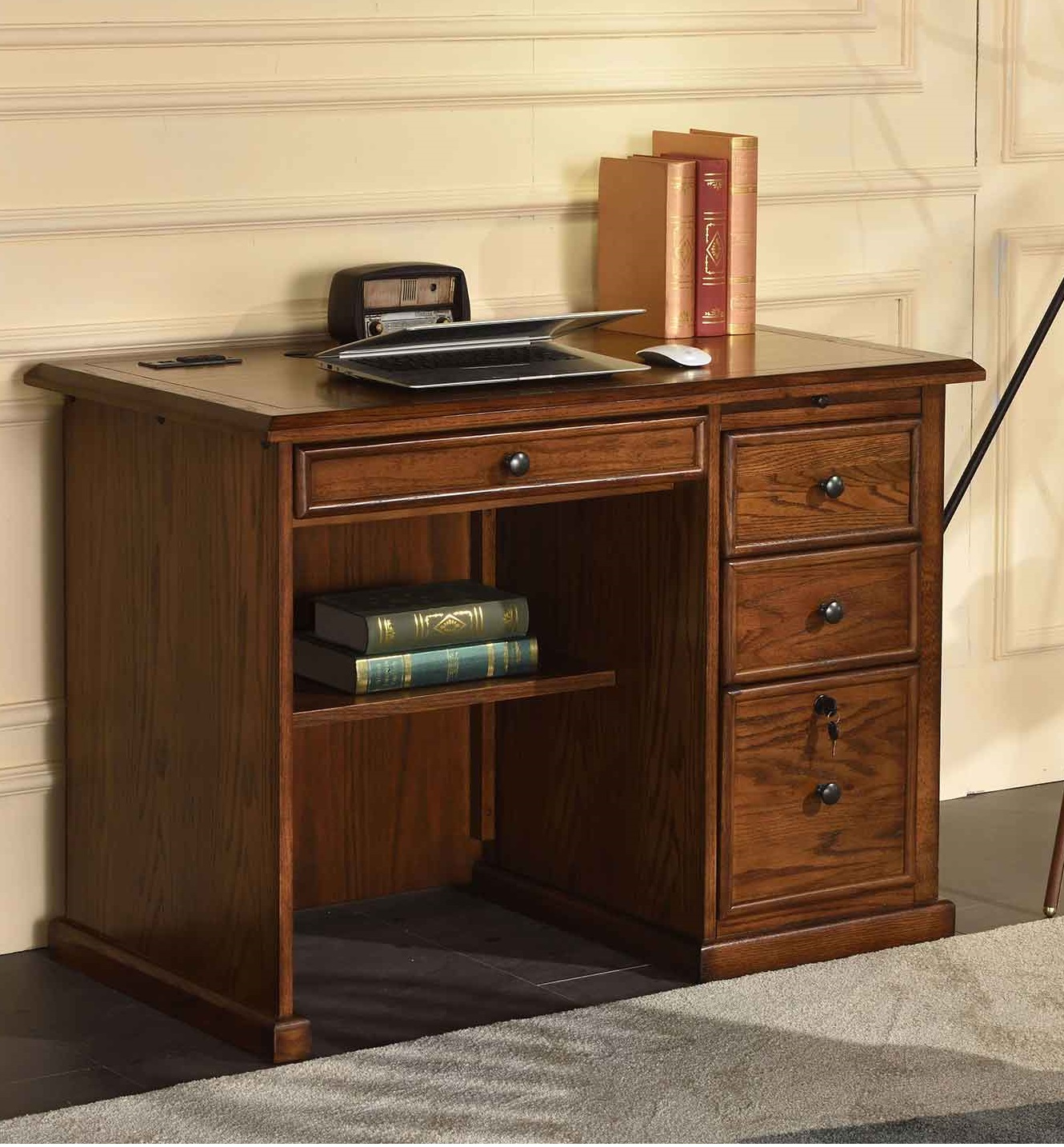Includes flip-down panel for keyboard / mouse or tablet, memo pull-out shelve and three storage drawers. Lower file drawers hold the letter or the legal size of the hanging papers. Cord management system features desk top grommets, a range of pass-throughs and a USB power outlet for easy access.