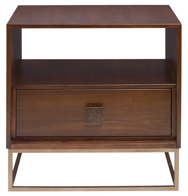 Versatile function with modern styling, fully finished in a dark walnut over walnut veneer. Features an open pass-through for decorative storage and a pull-out drawer with an embossed metal pull finished in antique brass, set atop a brushed brass open framed iron base.Read More