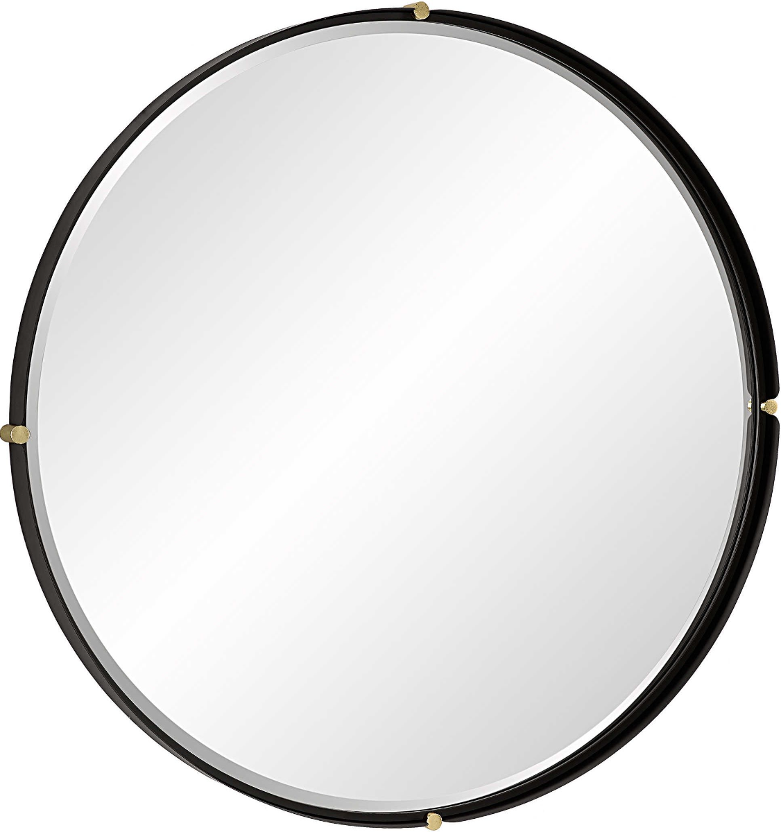 This large round mirror showcases a strap style iron frame finished in a sleek matte black with soft curved ends that encompass antique gold column medallions. The floating style mirror has a generous 1.25" bevel.Read More