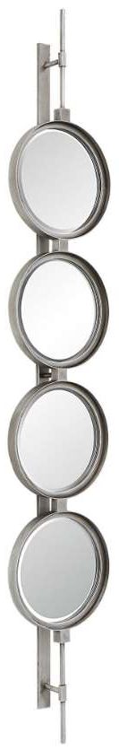 Contemporary in style, this mirror features a sleek iron base with linear metal accents. The piece is finished in silver leaf with four round beveled mirrors. Group multiple pieces together and hang horizontal or vertical to create a truly unique wall feature.Read More