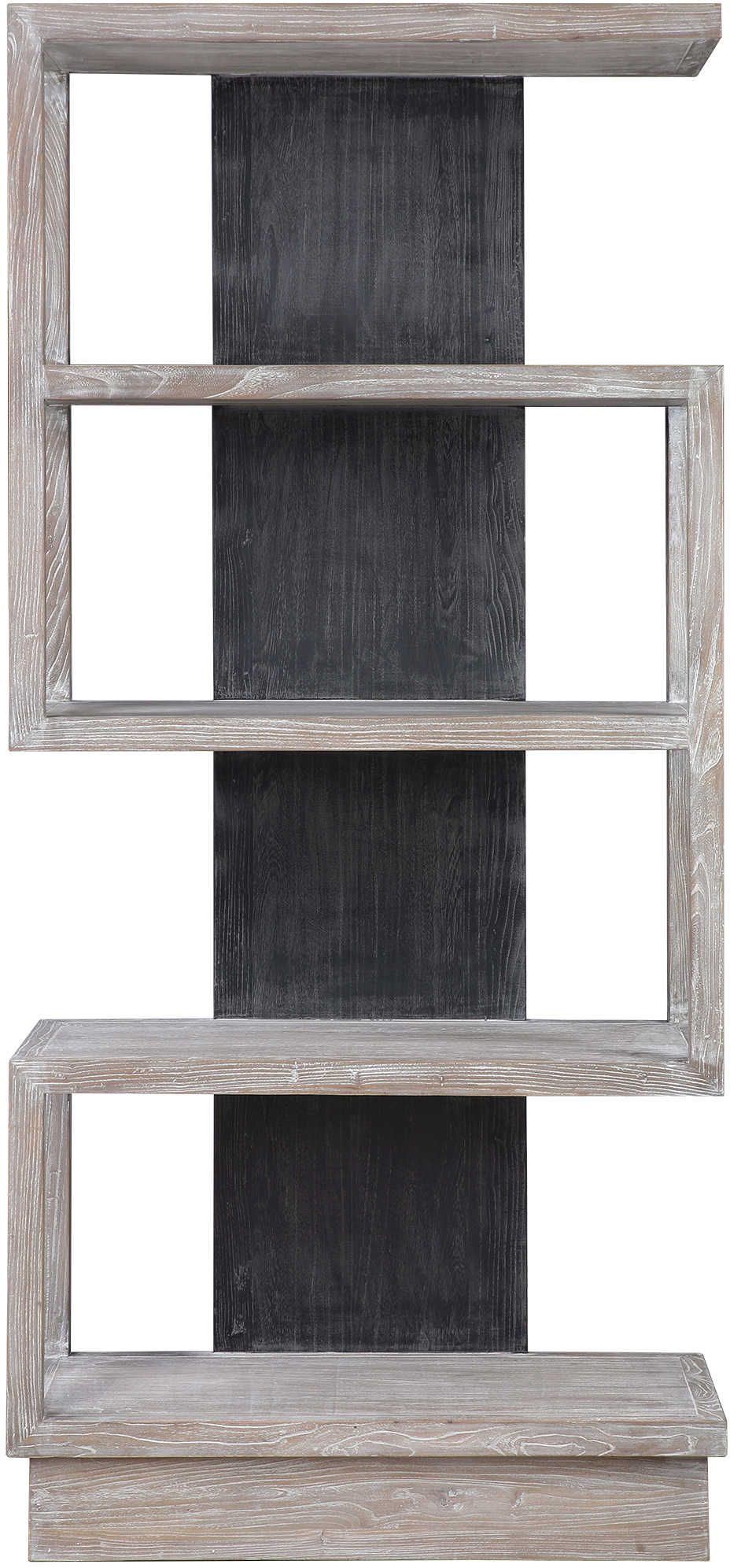 The dramatic contrast of this asymmetrical etagere gives an updated contemporary feel, featuring elm veneer shelving finished in light gray, accented with a deep black recessed panel with a light gray glazing.Read More