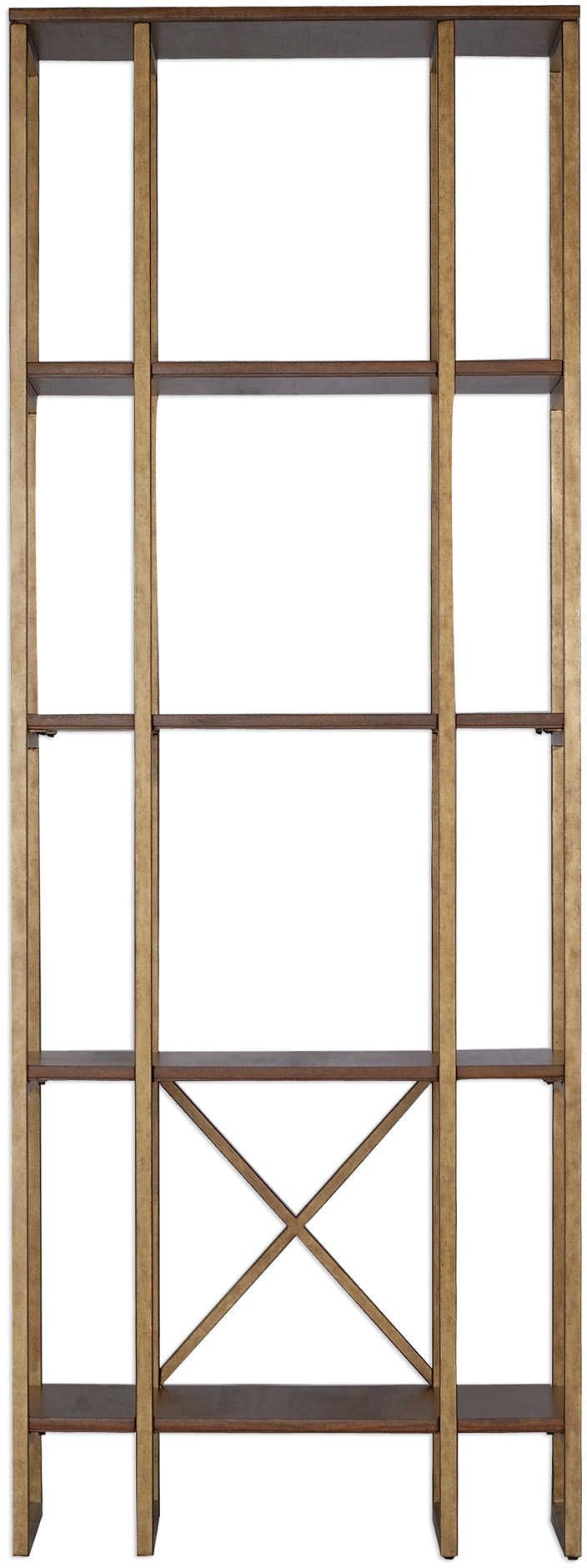 Easily display items on this transitional etagere, finished in a brushed antique gold and accented by four acacia veneer fixed shelves in a rich dark walnut stain.