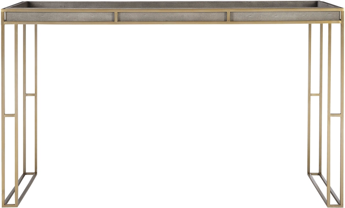 Exhibiting a modern minimalist design, this tray style console table features a rich, charcoal gray faux shagreen paired with a plated brushed brass steel frame.