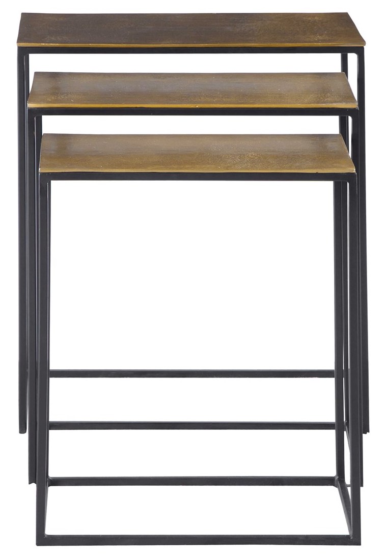Functional nesting tables constructed in an aged black iron, featuring a cast textured aluminum slab top finished in a plated antique gold.