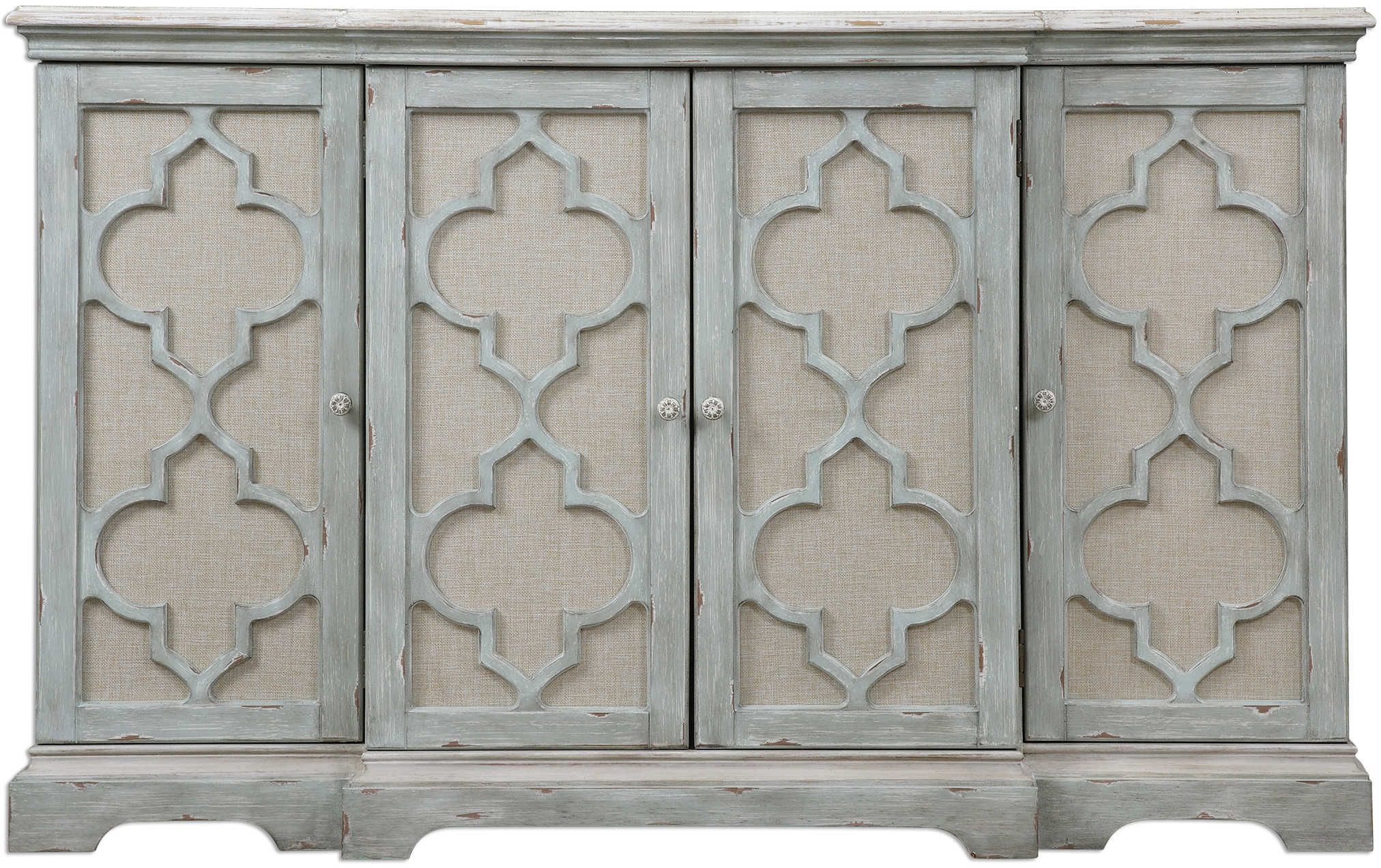 Break front console in weathered sea gray with ivory accents. Open-carved doors are backed in light tan linen, enclosing three adjustable shelves.