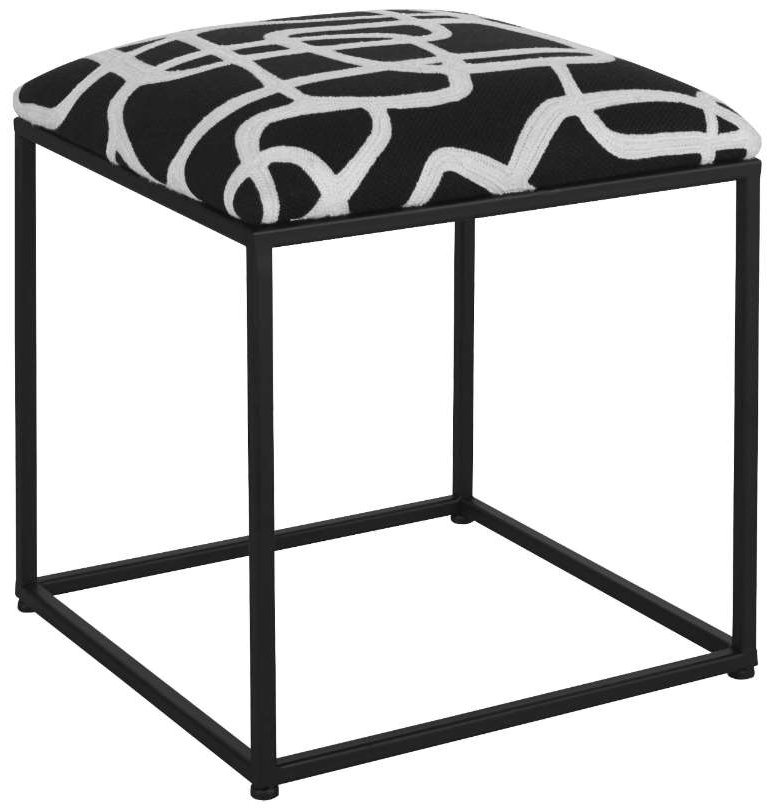 Sophisticated with a touch of whimsy, this accent stool features a cushioned seat upholstered in a contemporary black and white embroidered fabric, atop a matte black iron base. Doubles as added seating or a footrest.Read More